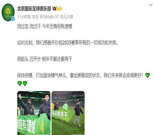 賽后,國安球員拉出兩張橫幅,第一張上面寫著:“流過血 流過汗 今年無悔但有遺憾”。第二張印著:“昂起頭 邁開步 明年不服還要再干”。俱樂部官微上還打出一句話:“保持拼搏,打出國安精氣神兒,拿出更穩定的狀態,我們未來就會變得更好!”